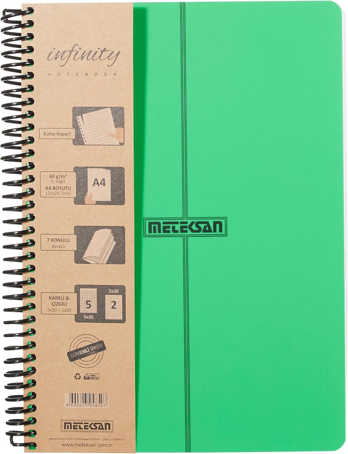 350 mikron PP (plastik) kapak 60 gr 1. hamur kağıt Pet spiralli 210 yaprak, 420 sayfa, 7 konulu (5 kareli, 2 çizgili) Türkiye'de üretilmiştir Primary Serisi, A4, 7 Konulu (5 Kareli, 2 Çizgili) 210 Yaprak PP Kapaklı Spiralli Defter, Yeşil