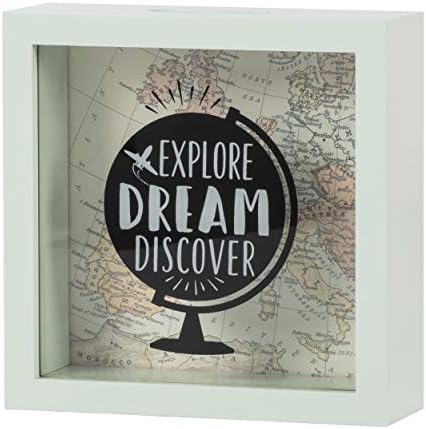 Ekran baskılı tasarım “Explore ” yazıyor Çıkarılabilir destekçi, sallanan sekmelerle bankaya sabitlenir; ön taraftaki cam panel zıt beyaz metinle basılmıştır Handpainted MDF çerçeve Üstte madeni paralar veya faturalar için yuva; paranıza erişmek için çıkarılabilir destekçi Genel banka ölçüleri 6 “x 6″ x 2” inç Prinz Explore Money Savings Yetişkinler için Kumbara, Çocuklar için Tasarruf Kutusu Değiştirme Kavanozu, 15,8 cm x 15,5 cm Ahşap Gölge Kutusu, Açık Yeşil