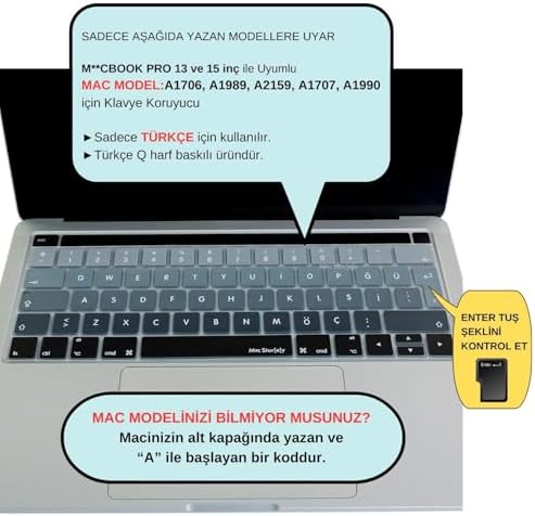 Pro Klavye Koruyucu Türkçe Q Silikon İnce Bar A1706 A1989 A2159 A1707 A1990 Uyumlu 13 ve 15 inç Ters L Enter Siyah Gri