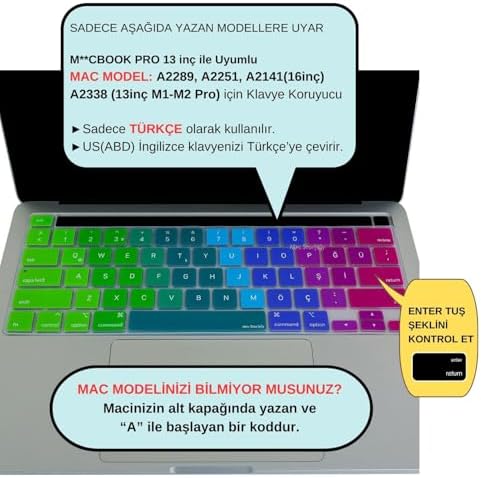 TURKCE Q BASKILI – US ANSI DUZ ENTER UYUMLU; US düzeni fiziksel klavyeyi Türkçe Q düzenine dönüştürür, tam tuş hizası sağlar. INCE SILIKON YAPI – SESSIZ YAZIM; 0.3 mm ultra ince malzeme tuş hissini korur ve sessiz yazım deneyimi verir. TOUCH BAR MODELLER ICIN HASSAS KESIM; A2338 M1/M2, A2251, A2289 ve A2141 için lazer kesimli mükemmel uyum. TOZ, KIR VE SIVI KORUMASI – YIKANABILIR; Toz ve kir birikimini önler, sıvı sıçramalarına karşı koruma sağlar, tamamen yıkanabilir silikon. UYARI – UYUMLU DEGILDIR; Enter tipiniz US ANSI düz Enter değilse uymaz. UK ISO Ters L Enter modellerle uyumlu değildir. Baskı dili Türkçe Q’dur; İngilizce veya Rusça isteyen kullanıcılar için uygun Pro Klavye Koruyucu Türkçe Q US Düz Enter Uyumlu İnce Silikon Bar 13 M1-M2 ve 16 inç Klavye Koruma Kaplama Pembe Yeşil
