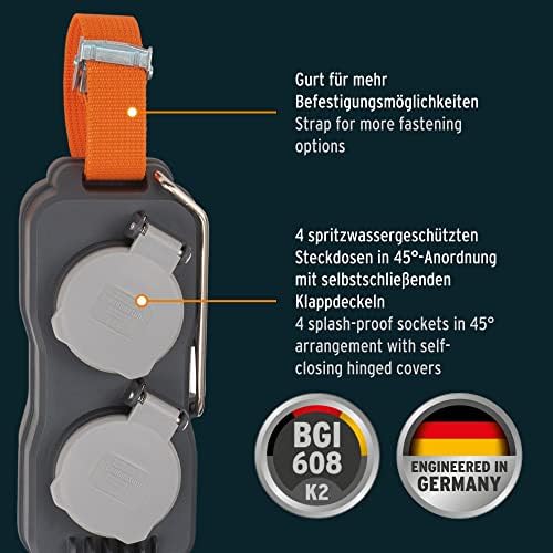 Dört prizli mobil güç bloğu, iskele veya çatı vs. üzerinde kullanışlı kullanım için – kablosuz Optik hazırlık göstergeli 4'lü dağıtıcı, ayrıca katlanabilir metal asma kancası ve daha fazla sabitleme imkanı için kayış Ergonomik darbe ve kırılmaya dayanıklı priz bloğu, sağlam tasarım 45° düzeninde sıçrayan suya karşı korumalı dört prizli dış mekan dağıtıcısı, kirlenmeye karşı koruma için kendiliğinden kapanan katlanır kapaklı IP54 koruma türü ile (toz ve su sıçramalarına karşı korumalı) çoklu priz kalitesi, dayanıklılığı ve güvenliği ile tüm alanlarda öne çıkar professionalLINE Powerblock/dağıtıcı priz 4'lü (şantiye kullanımı ve açık havada sürekli kullanım, IP54)