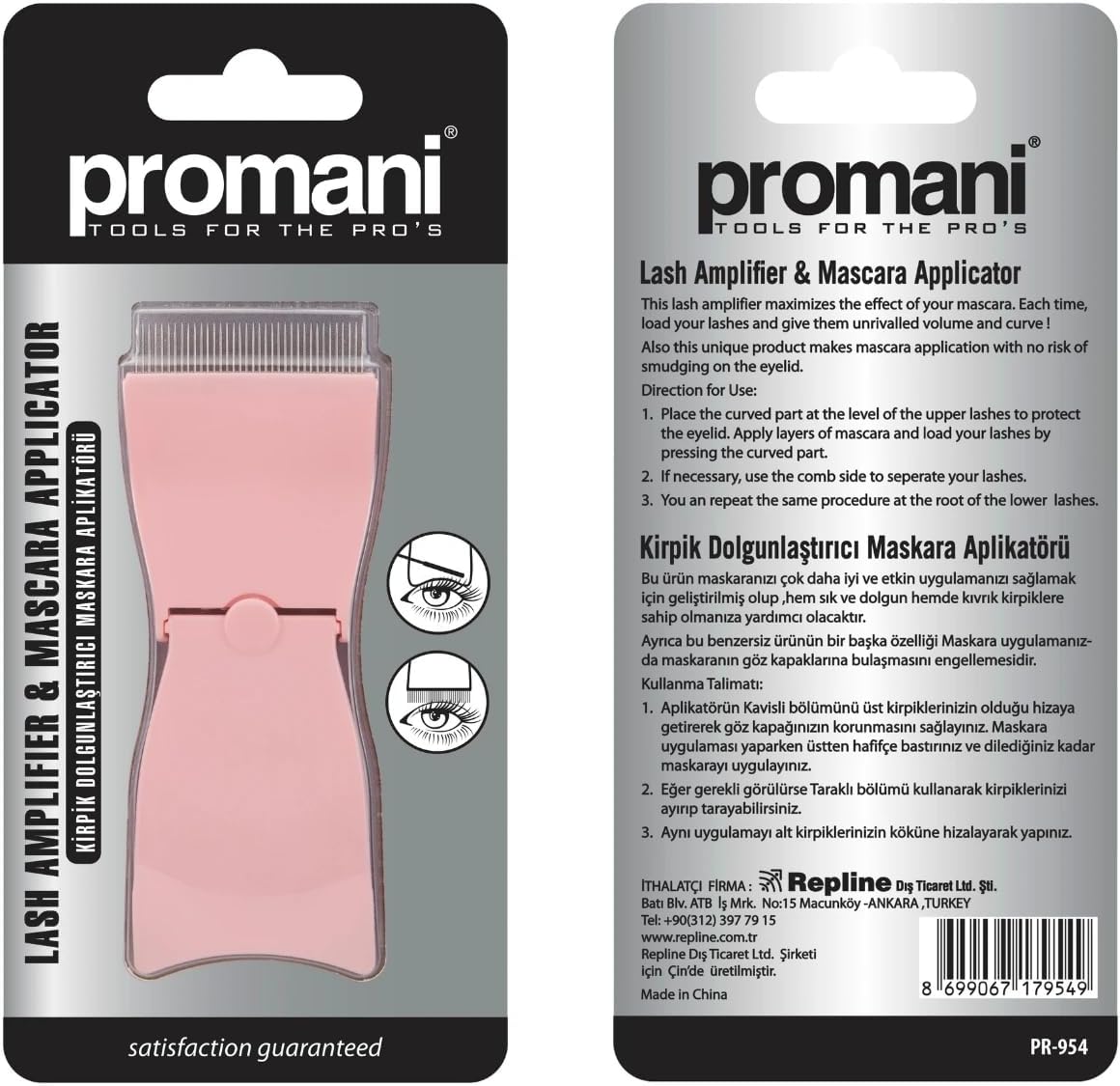 Maskara aplikatörü dolgun ve kıvrık kirpiklere sahip olmanıza yardımcı olur. Maskaranın göz kapaklarına bulaşmasını engeller. Aplikatörün kavisli bölümünü üst kirpiklerinizin olduğu hizaya getirerek göz kapağınızın korunmasını sağlayınız. Gerekli görürseniz taraklı bölümü kullanarak kirpiklerinizi ayırıp tarayabilirsiniz. Aynı uygulamayı alt kirpiklerinizin köküne hizalayarak yapınız. Promani Kirpik Dolgunlaştırıcı Maskara Aplikatörü PR-954