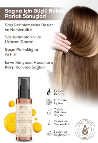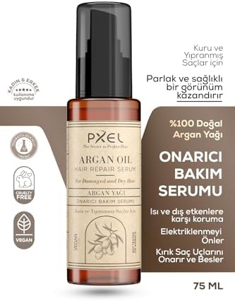 Doğal yağlar ✨ Elektriklenme karşıtı Ağırlık yapmayan hafif formül ️ Isı koruyucu etki Kadın ve erkek kullanımı için uygundur PXEL Saç Onarıcı Serum 75 ML – Argan Yağı, Hindistan Cevizi Yağı ve E Vitamini İçerikli | Yıpranmış, Mat ve Kabaran Saçlar İçin Parlaklık ve Yumuşaklık Sağlayan Onarıcı Vegan Saç Serumu
