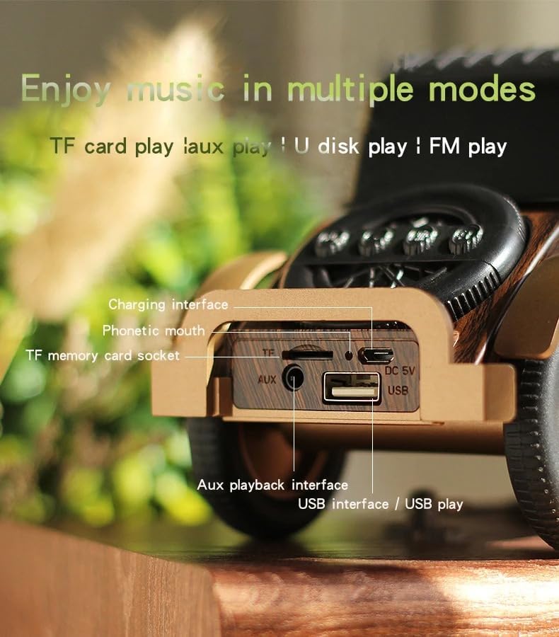 Yüksek Kaliteli Ses Performansı: 10W çıkış gücüyle güçlü, dengeli ve dolgun ses sağlar. Hi-Fi tam frekans teknolojisi sayesinde bas ve tiz netliği mükemmeldir. Uzun Ömürlü 1800mAh Batarya: 3–6 saate kadar kesintisiz müzik keyfi sunan dahili şarjlı pil ile kablosuz özgürlük yaşayın. Birden Fazla Oynatma Seçeneği: Bluetooth, TF kart, USB bellek ve AUX desteğiyle dilediğiniz kaynaktan müzik çalın. Retro Ahşap Araba Tasarımı: Klasik otomobil görünümüyle hem dekoratif bir obje hem de modern bir hoparlör işlevi sunar. Kolay Kullanım Butonları: Şarkı geçişi, ses kontrolü ve durdurma fonksiyonlarını pratik tuşlarla kolayca yönetin. Kablosuz Bağlantı: Bluetooth 5.0 teknolojisi ile 10 metreye kadar kararlı bağlantı, düşük gecikme ve enerji verimliliği sağlar. Eller Serbest Görüşme Özelliği: Dahili mikrofon sayesinde gelen çağrılara tek tuşla yanıt verin. Taşınabilir ve Dayanıklı Gövde: ABS plastik ve ahşap desenli dış yüzey, hem hafif hem de darbelere karşı dayanıklıdır. Şık ve Fonksiyonel Hediye Seçeneği: Ev, ofis veya özel günler için retro tutkunlarına ideal bir müzik hediyesi. Retro Ahşap Araba Şekilli Kablosuz Bluetooth Hoparlör – 1800mAh Şarjlı, 10W Güçlü Ses, USB/TF/AUX Destekli, Hi-Fi, Telefon Standlı Dekoratif Nostaljik Müzik Hoparlörü | A9