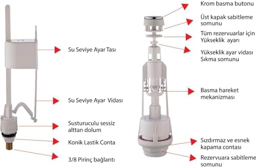 Yükseklik Ayarı: Tüm rezervuarlar için yükseklik ayarı sağlayan vida ve somun mekanizması. Basma Hareket Mekanizması: Krom kaplı basma butonu sayesinde kolay ve sağlam bir kullanım sunar. Sızdırmaz Kapama Contası: Sızdırmaz kapama contası sayesinde su kaçağı riskini en aza indirir. Konik Lastik Conta: Konik şekilli lastik conta, rezervuarı sıkıca sabitlemeyi sağlar. Susturucu: Sessiz ve konforlu bir kullanım için susturucu alttan dolum mekanizması. Rezervuar İç Takım Seti