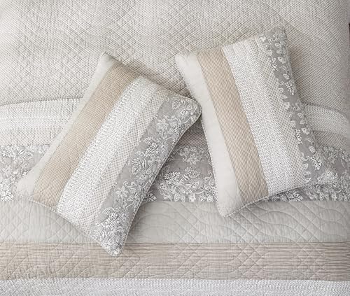 Robyn 3 Parça Nötr Boz Kahverengi Gri Beyaz Çiçekli Çiçeği Yama İşi Çizgili Yorgan Seti – Önceden Yıkanmış Pamuklu Örtü – Hafif Ters Çevrilebilir Yatak Örtüsü, Battal Boy
