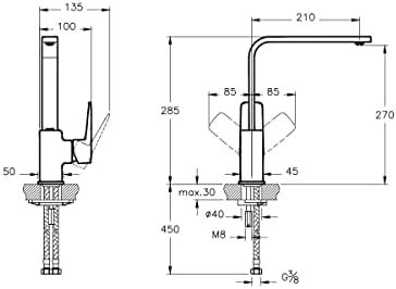 Çıkış ucu uzunluğu 210 mm’dir Çıkış ucu yüksekliği 270 mm’dir 360° döner boruludur Özel debi kısıcılı perlatör sayesinde max. 5 L/dk su akışı sağlanmaktadır.Isı ve debi limitörlü özel kartuş Kumanda kolu sağ veya sol tarafta kullanım için uygundur Root Square A42753 Eviye Bataryası, Krom