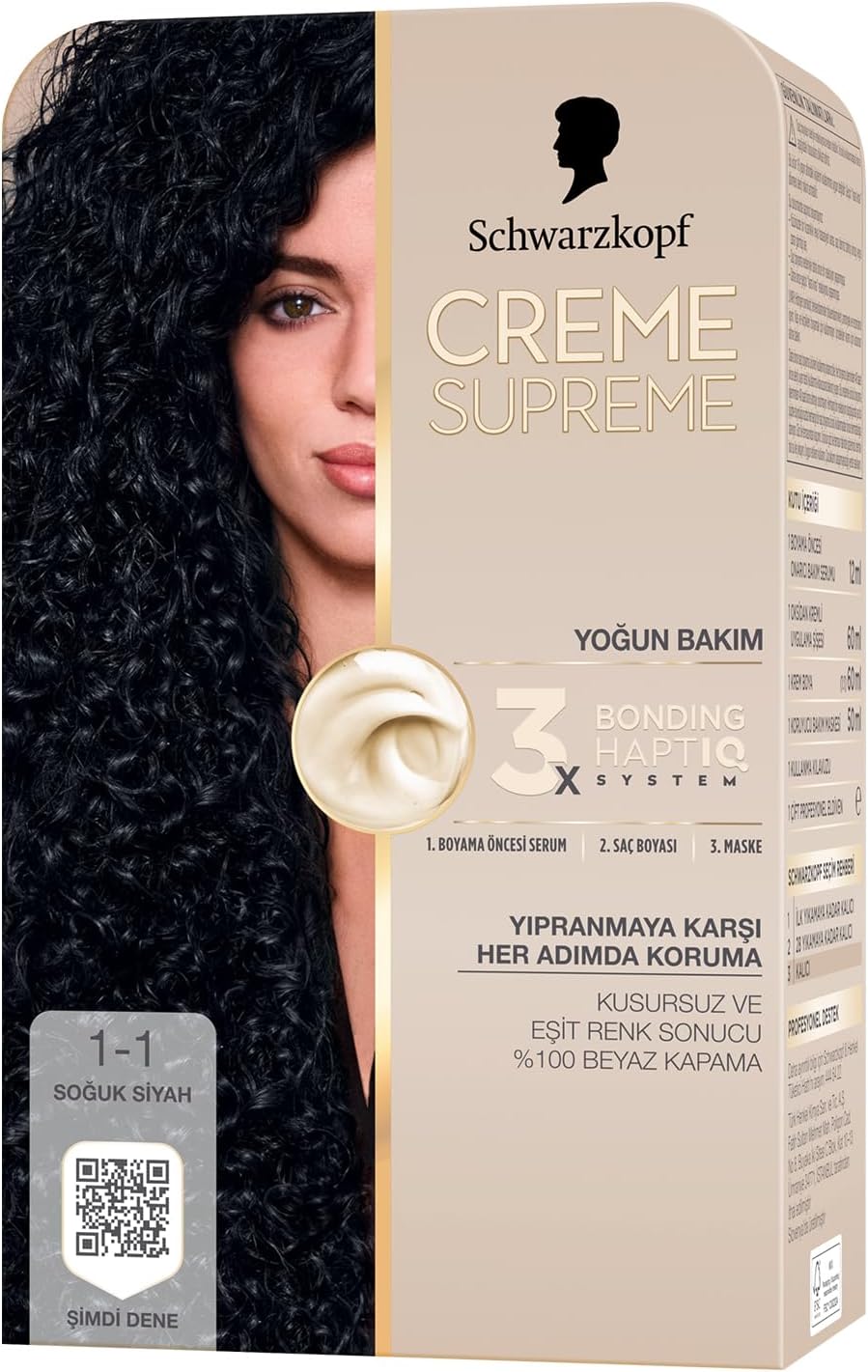 Haptiq System teknolojisi ile geliştirilen üç adımlı bakım sistemi, boyama öncesi, sırası ve sonrasında saçı yıpranmalara karşı korur Boya öncesi güçlendirici serum: Özel formüllü serum, saçta mikro bağlar oluşturarak boyama işlemi öncesinde dayanıklılık sağlar Saçları renklendirir ve koruma sağlayarak sağlıklı görünüm kazandırır Saç onarıcı maske ile bakım: Boyama sonrası uygulanan maske, saç telini kaplayarak bakım etkisini korur Saç Boyası 1-1 Soğuk Siyah