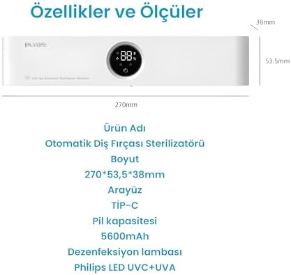 Diş fırçası tutacağı ve Uv sterilizatörü, Type-C arayüzü ile şarj edilen cihaz, 5600mAh pil kapasitesine sahiptir. CE, ROHS, FCC ve QC sertifikalarına sahip olup patentli bir tasarıma sahiptir. 5V anma gerilimi, 2A anma akımı ve 4W anma gücü ile çalışmaktadır. UVC ve UVA dezenfeksiyon lamba boncukları sayesinde etkili sterilizasyon sağlar. Ultraviyole dezenfeksiyon, endüktif açma ve kapama, sağlıklı hava dolaşımı ve uzun pil ömrü gibi özelliklere sahiptir. Aynı anda 5 diş fırçası için dezenfeksiyon imkanı sunan cihaz, 270×53.5×38 mm boyutlarındadır. Ürünün renk kutusu boyutu ise 310x76x51 mm'dir. Şarj Edilebilir Diş Fırçası Tutacağı Tam Otomatik Sensörlü Uv Sterilizatör (Led Teknolojisi) MAVİ