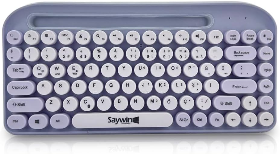 Saywin Bluetooth Klavye Renkli Retro Kablosuz Klavye Daktilo Görünümlü Tuş Tasarımı Şık ve Kullanışlı Telefon Koyma Gözü Pilli Türkçe Q Klavye SW-05 (Mor)
