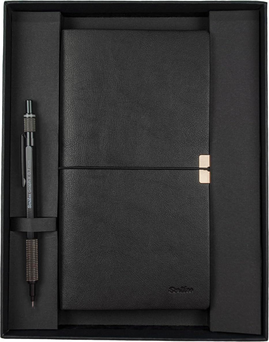 Yumuşak dokulu mikrofiber PU suni deri kapak ve iç yüzey Kapakta logosu İç defterlerin sırtında görünür dikişler Sayfaların sağ üst köşesinde, tarih yazma bölümü SD700-C1 Premium Defter Toledo C7 Siyah & Graph-X Versatil Mat Siyah Set