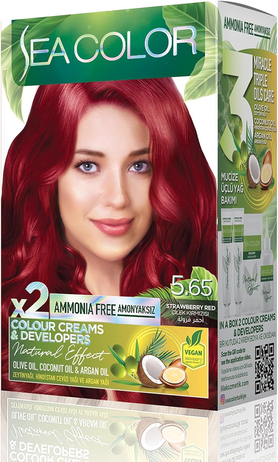 SEA COLOR Amonyaksız, Vegan, Doğal, Besleyici Kalıcı Saç Boyası%100 Beyaz Kapama (1 PAKET 2 x 50 ml Boya & OKSİDAN) (Çilek Kırmızısı 5.65)