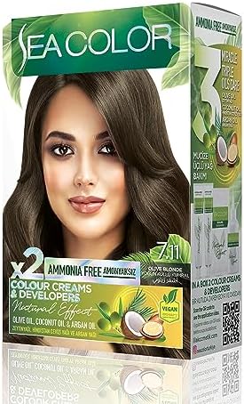SEA COLOR Amonyaksız, Vegan, Doğal, Besleyici Kalıcı Saç Boyası%100 Beyaz Kapama (1 PAKET 2 x 50 ml Boya & OKSİDAN) (Yoğun Küllü Kumral 7.11)