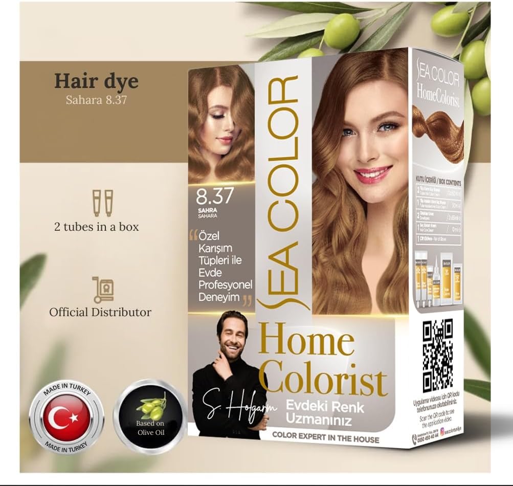 SEA COLOR HOME COLORIST (Asistan Boya Desteği) Kutu İçeriği: 2 Tüp Krem Saç Boyası (50 ml) 1 Tüp Asistan Krem Saç Boyası (30 ml) 2 Oksidan Krem (2×65 ml) 1 Saç Bakım Kremi (10 ml) 1 Çift Eldiven Sea Color HomeColorist Serisi ile kullanıcının profesyonel klara ihtiyaç duymadan, daha yoğun beyaz kapamak, renk yoğunluğunu artırmak ve istenmeyen oluşumlarını engellemek gibi işlemleri kendi başına evde yapabilmesi hedeflenmiştir Boya seti boya içinde esas renge destek olacak ve asistan boya olarak adlandırılan 30 ml tüp eklenmiştir Asistan boya desteği ile; Daha iyi beyaz kapama, Daha canlı renk sonuçları, Bazı renklerde oluşabilecek istenmeyen kızarıklıkları nötralize etmek amaçlanmıştır 20 renk seçeneği sunar Sea Color Home Colorist 8.37 Sahra Sahara