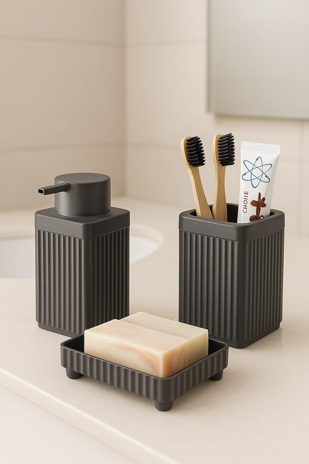 Serisi Açık Gri Banyo Seti, 3 Parça Diş Fırçalık, Sıvı Sabunluk, Katı Sabunluk Aksesuar Takımı Gri