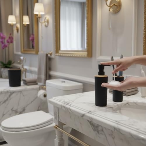 Set; çöp kovası, tuvalet fırçası, sabunluk ve dişlik düzenleyicisinden oluşur, her bir ürün uzun ömürlü kaliteli malzemelerle üretilmiştir ve kullanım konforu sağlayacak şekilde ergonomik tasarlanmıştır. Siyah mat gövde ve altın kapak detayları banyonuza modern, zarif ve estetik bir hava katarken aynı zamanda lüks bir görünüm oluşturur. Suya dayanıklı plastik yüzey yapısı sayesinde ürünler uzun süre deformasyon göstermeden kullanılabilir, temizlemesi kolaydır ve hijyen açısından avantaj sağlar. Çöp kovası sessiz kapanır, sabunluk kontrollü dozaj verir, fırça ve düzenleyici ise banyo düzenini kolayca sağlamanıza yardımcı olur. Ev, ofis, otel ve misafir banyolarına uyum sağlayan set, hem dekoratif hem de oldukça işlevsel yapısıyla şık ve düzenli bir kullanım alanı sunar. Şık 4’lü Banyo Seti – Çöp Kovası, Tuvalet Fırçası, Sıvı Sabunluk ve Diş Fırçalık| Modern ve Dayanıklı Tasarım