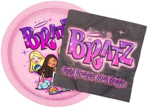 Silver Buffalo Bratz Dolls 32 Parça Mor Kağıt Peçete ve Tabak Parti Paketi Yasmin, Sasha, Jade ve Cloe