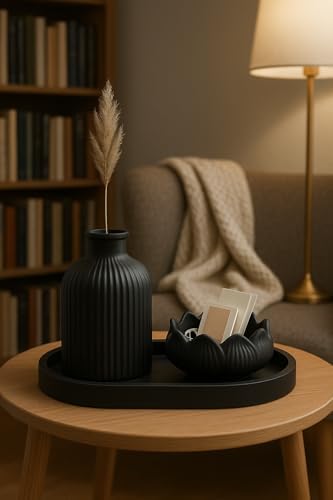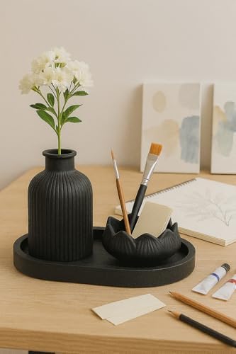Siyah Kase ve Çizgili Vazo Seti – 3’lü El Yapımı Tepsili Minimalist Dekor – Modern Ev & Ofis Aksesuarı