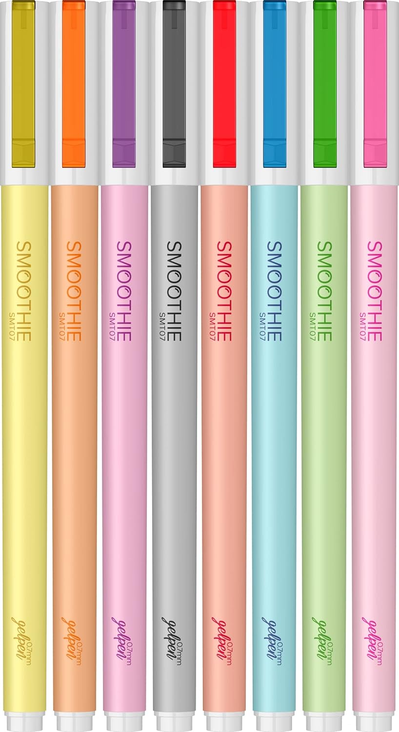 Nikel kaplama uç Renkli yumuşak zarif gövde Yoğun ve akıcı mürekkebi sayesinde kolay yazım imkanı 0.7 mm yazım kalınlığı Smoothie Jel Kalem 8'li Blister
