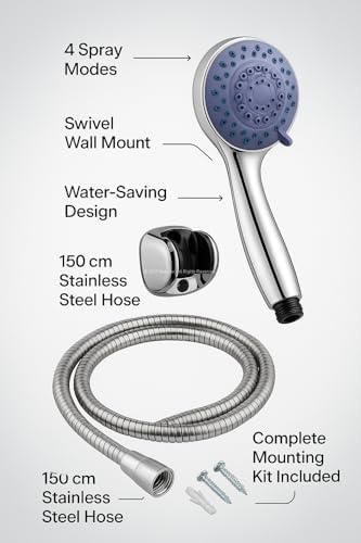 Spiralli Duş Başlığı Seti, 4 Fonksiyonlu Krom Duş Başlığı, 150 cm Duş Hortumu, Mafsallı Başlık, Vida ve Dübel Dahil, Su Tasarruflu, Duvara Monte Banyo Takımı