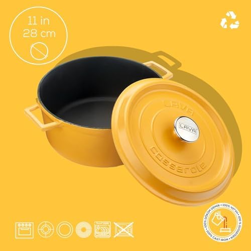 Tencere Yuvarlak 28 cm Döküm Demir Yekpare Kulplu Mat, Parlak Siyah Taban 3 Kat, 3 Fırın Döküm Demir Trendy Kapak Metal Tepe Spring Serisi – Döküm Tencere, Yuvarlak, 28 cm, Mat, Parlak Siyah Taban, Sarı