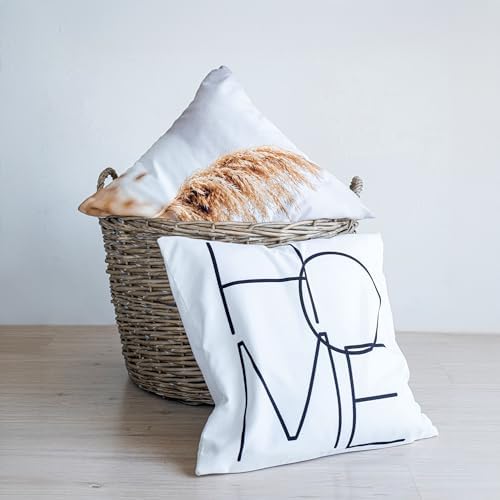 “HOME” yazılı Pampas otu Temalı Özel Tasarım 2'li Yastık Kılıfı, Dijital Baskı Kırlent Kılıfı, Beyaz Renk, 43×43 Cm