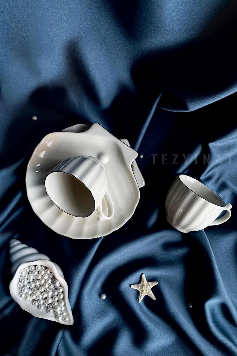 İsitirdye formunda Tezyinat -İstiridye İnci 4 Parça 2Kişilik Porselen Kahve Fincan Takımı (PLATİN YALDIZLI)