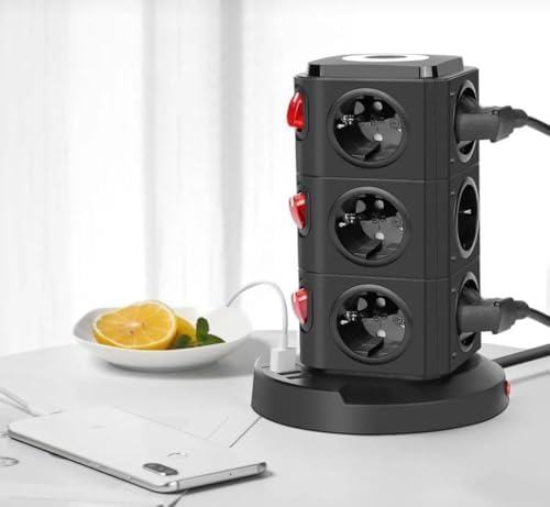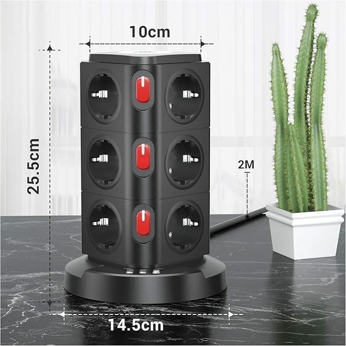 AKIM KORUMA ÖZELLİĞİYLE HER AN GÜVENDESİNİZİ Tower Tipi Akım Korumalı Priz – 12 Prizli ve 4 USB Girişli, Bireysel Anahtarlı, Kısa Devre Koruma, Masa Üstü Dikey Tasarım – Ev ve Ofis İçin Düzenli Çözüm