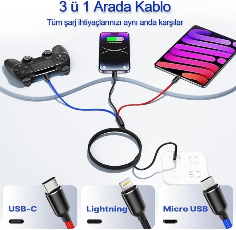 Çoklu USB Kablosu: Tüm USB Type-C/micro USB/ Lightning cihazları ile çalışır. iphone 15/15 Pro/ 15Pro Max 14/14 Pro/ 14Pro Max/13 Pro/12/12mini/12 Pro/12 Pro Max/11/11 Pro/11 Pro Max/Xs Max/XS/XR/X/8/8 Plus Plus/7/7 Plus/6/6 Plus & Pod/Pad Mini, Air, Pro, Micro-USB için Galaxy S7/S6/S4 ve çoğu telefonlar & Kablosuz Aksesuarlar, Type-C uyumlu Galaxy S10+/S10S9/S9+/S8/S7,, HTC, SONY,, Moto. UYGUN ELEKTRONİK Hızlı Şarj ve Data Aktarım Kablosu, 60W – 3A USB A, Type C (Usb c), Micro USB, Lightning Uyumlu 3 ü 1 Arada Çoklu Kablo