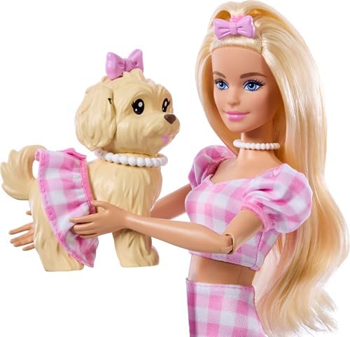 Uyumlu Dostlar sarı saçlı bebek ve köpekçiği, desenli, pembe renkli kıyafetler giyen ve güneş gözlüğü, kolye ve fiyonk gibi aksesuarlar takan, JFP36