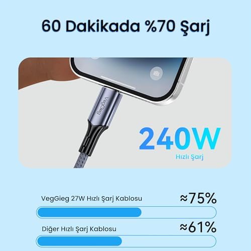 Veggieg USB 4.0 E-Mark 240W 40Gbps Thunderbolt 4 8K 60Hz Type-C Görüntü Hızlı Şarj ve Data Kablosu 50 CM