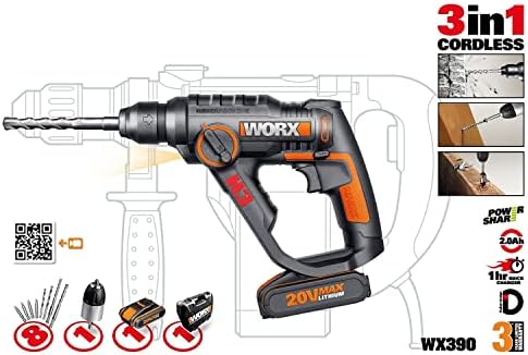 WX390.1 20Volt 2.0Ah. Li-ion 1.2J Profesyonel SDS-Plus Pnömatik Çift Akülü Şarjlı Matkap + 8 Adet Uç + Mandren