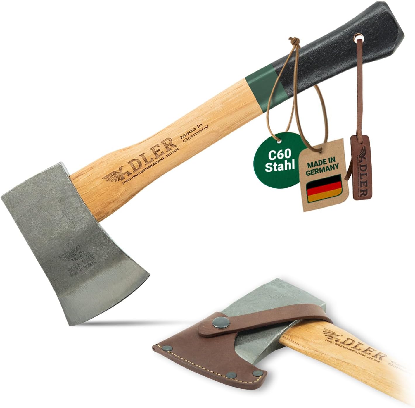 Alet kafası takozu: Ahşap kama ve çelik halka kama ile çift güvenlik takozu Orijinal ABD kaynaklı cevizden yapılmış sap – Almanya'da üretilmiştir Ağır hizmet tipi deri kılıf ve kordon dahildir. AB ve bitkisel tabaklanmış Kaymaz boyalı sap ve üç renk seçeneği (kırmızı, yeşil, kahverengi) Yankee Balta 650Gr, Ağaç Sap 38Cm, Yeşil/Siyah