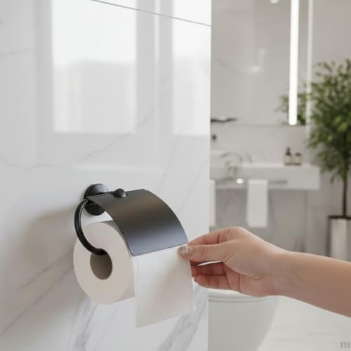 Yapışkanlı Tuvalet Kağıdı Askısı | Kapaklı Paslanmaz Metal WC Kağıtlık | 10 * 10 cm Siyah Renk | Delmesiz Kolay Kurulum